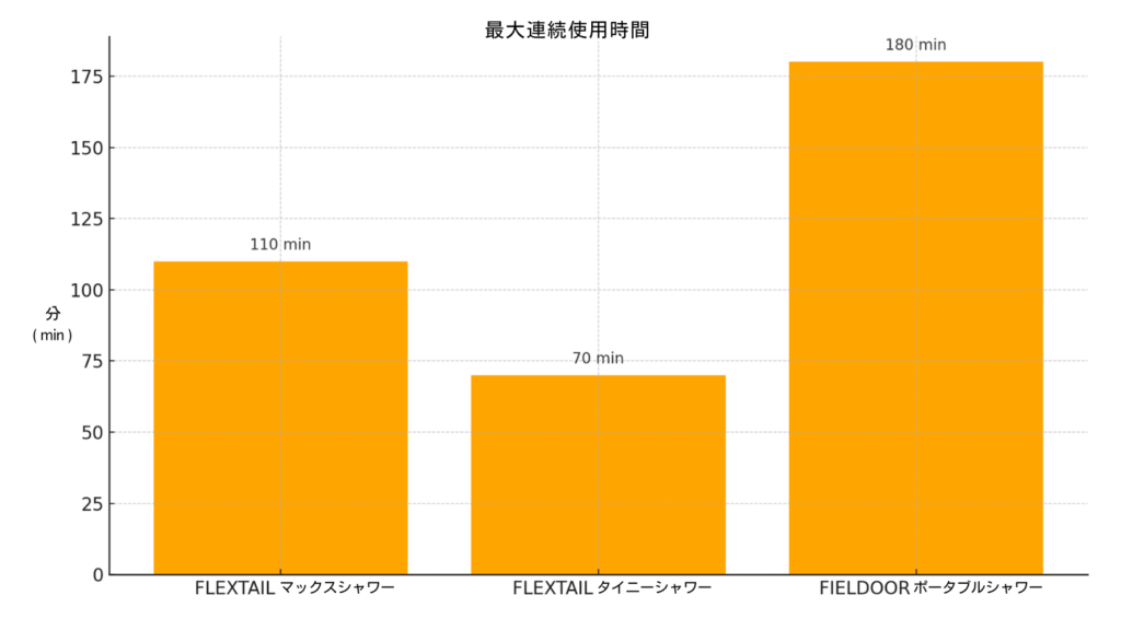• 人気3モデル(FLEXTAIL マックスシャワー、タイニーシャワー、FIELDOOR ポータブルシャワー)のスペック比較(価格、連続使用時間、水圧、温水対応、充電方式、重量、収納性、保証)rvlife-family.comrvlife-family.com+1rvlife-family.com+1